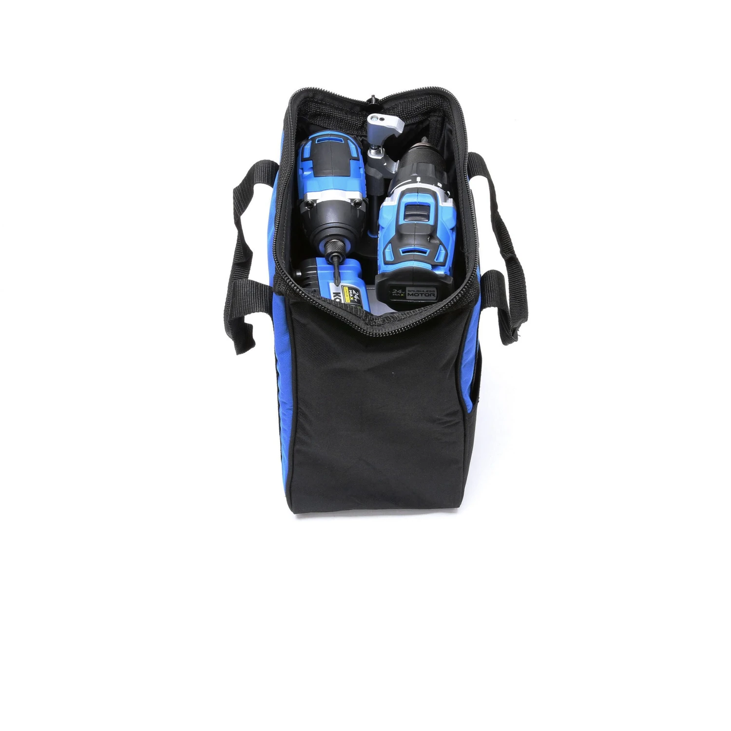 Undertake a variety of heavy-duty jobs with this Kobalt cordless power tool combo kit. It includes a 1/2 in drill/driver and a 1/4 in impact driver to help you tackle various tasks like high-speed drilling and subfloor installations. An included 24-V Max Li-ion battery powers these tools, providing extended runtime and more torque, and their highly efficient brushless motors are built to last. The drill/driver features a variable-speed trigger that generates up to 2000 rpm and a clutch with 23 torque settings, allowing you to match the speed to the task. The impact driver packs a punch, delivering up to 1800 in-lb of torque and 2700 rpm and also offering a finish function for maximum control to prevent overdriving screws. Both tools are equipped with LED lights to make them easier to use in dimly lit areas. Accessories include 1 double-ended driver bit, 1 single-ended driver bit, 2 bit holders, 2 belt clips, an auxiliary handle and a contractor bag. Battery and charger included.