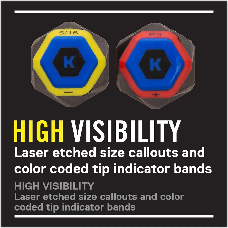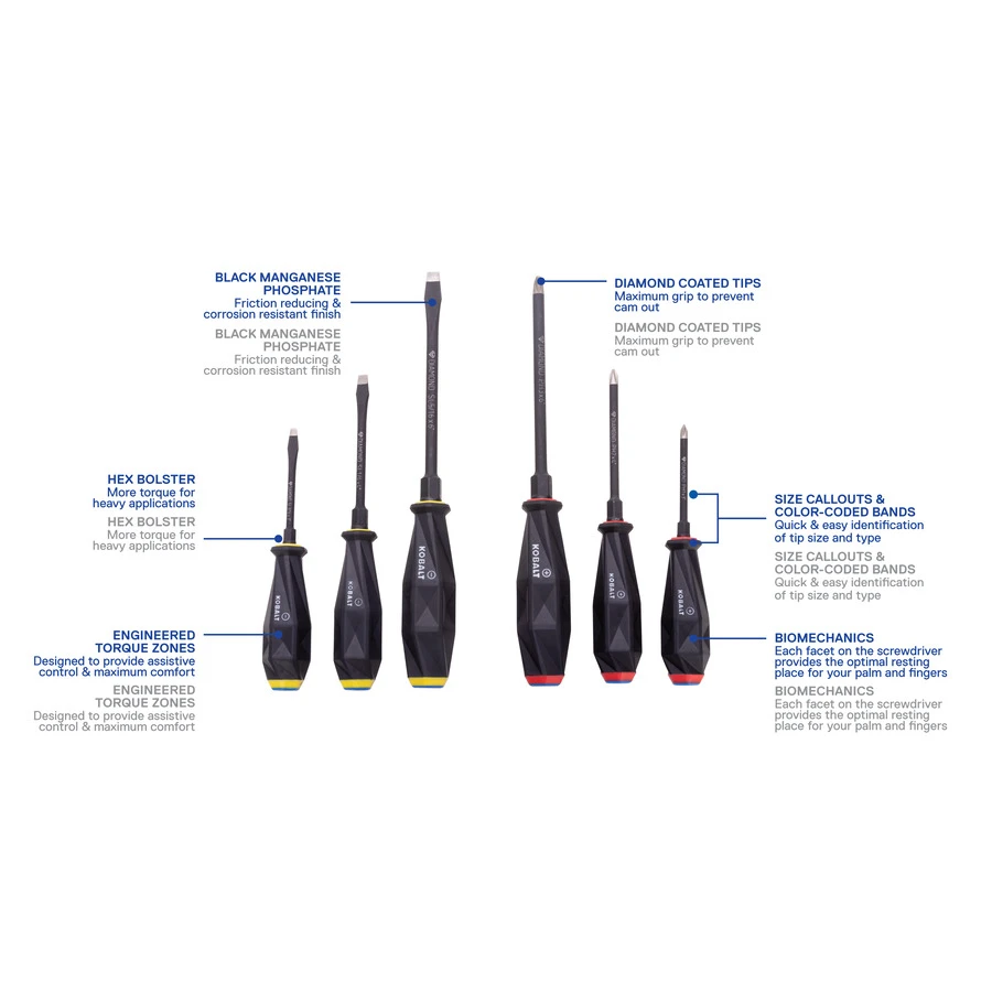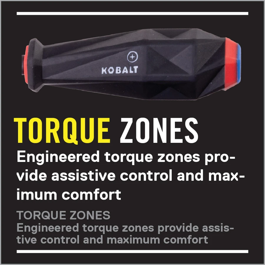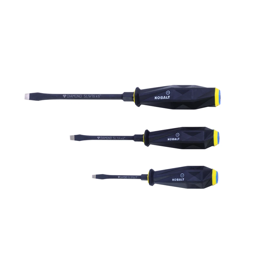 This set of 6 screwdrivers with advanced ergonomic handles have multiple zones of angled facets and indentations that provide secure surfaces for your fingers without the harsh edges digging into the palm of your hand when grasping full-handed. When more torque is needed to free a particularly stubborn or rusted fastener, a hex bolster on the shaft base allows a wrench to be used to provide that extra power needed to break them loose. Each screwdriver tip is diamond-coated, expanding by three the gripping power and greatly reduces the risk of cam-out and rounding of your fastener. Bright, colour-coded sections on both ends of each handle allow for easy identification of flat blade and Phillips tip styles. Additional style icons and moulded size callouts in the handle and laser-etched into the tool shaft also help to quickly identify your screwdrivers. With Kobalt Performance series hand tools, you will experience professional performance blended with personal design and comfort.