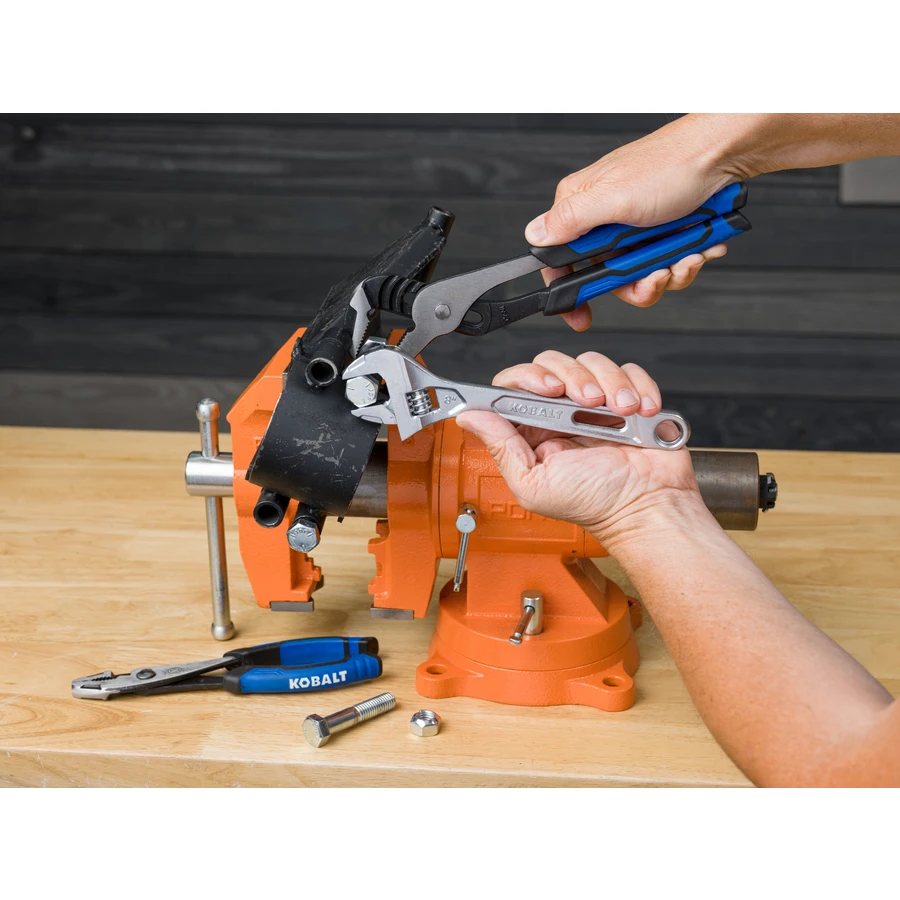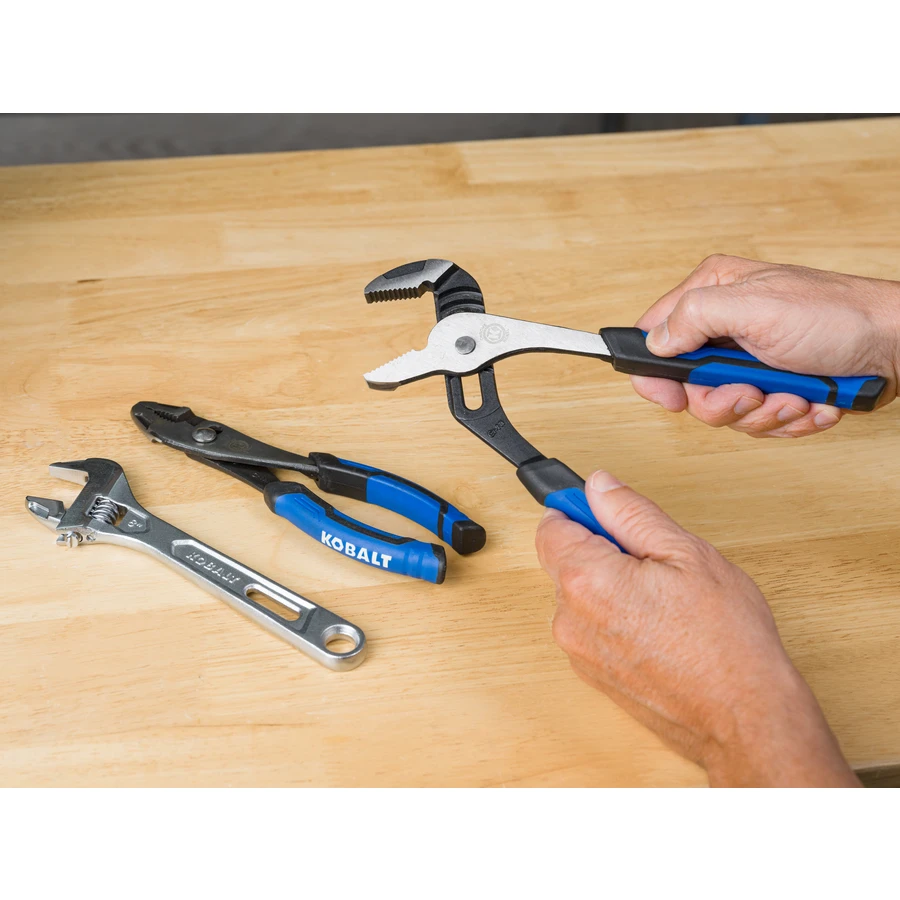 This Kobalt pliers and wrench set gives you the ability to handle a variety of home workshop projects. The tool set includes 8-inch slip-joint and 10-inch groove-joint pliers, 7-inch locking pliers and an 8-inch adjustable wrench with extra-wide opening jaws. Manufactured with tough, hard steel components that meet or exceed ANSI standards, the pliers in this 4-piece tool set have ergonomically shaped handles with comfortable over-molded and anti-slip grips.